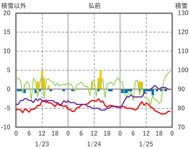 | 日 | 時 | 気温 | 降水 | 風向/風速 | 日照 | 積雪 | 降雪 |