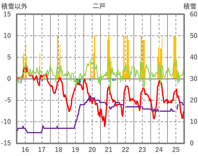 | 日 | 時 | 気温 | 降水 | 風向/風速 | 日照 | 積雪 | 降雪 |