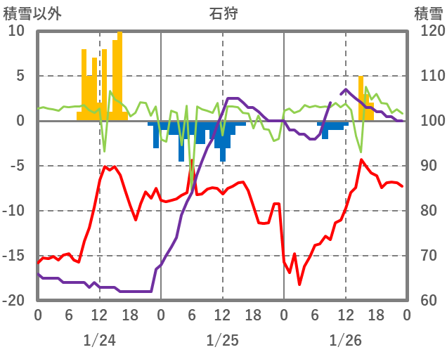 | 日 | 時 | 気温 | 降水 | 風向/風速 | 日照 | 積雪 | 降雪 |