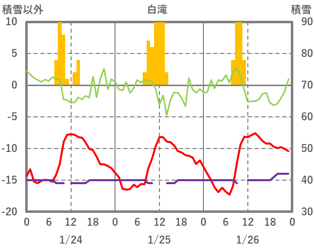 | 日 | 時 | 気温 | 降水 | 風向/風速 | 日照 | 積雪 | 降雪 |