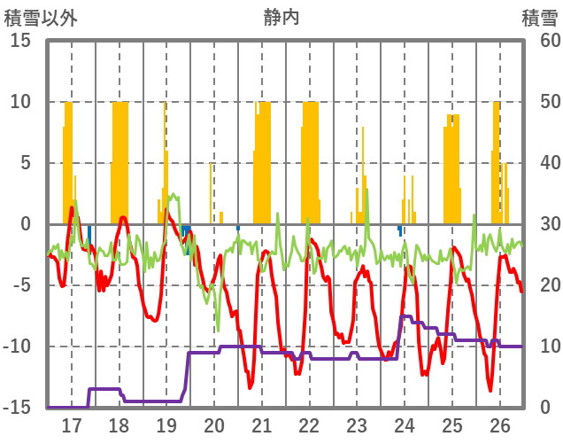 | 日 | 時 | 気温 | 降水 | 風向/風速 | 日照 | 積雪 | 降雪 |