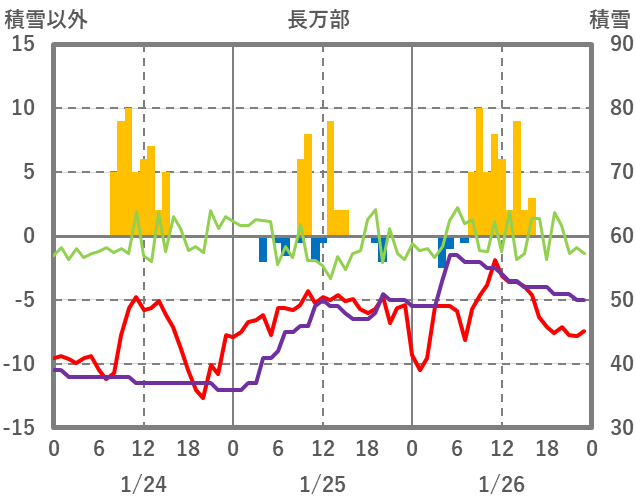 | 日 | 時 | 気温 | 降水 | 風向/風速 | 日照 | 積雪 | 降雪 |