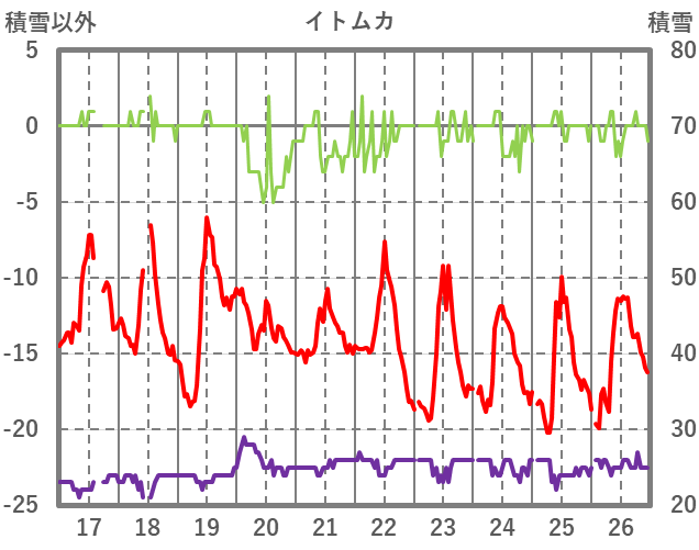 | 日 | 時 | 気温 | 降水 | 風向/風速 | 日照 | 積雪 | 降雪 |