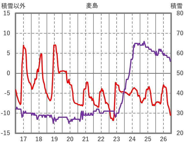 | 日 | 時 | 気温 | 降水 | 風向/風速 | 日照 | 積雪 | 降雪 |