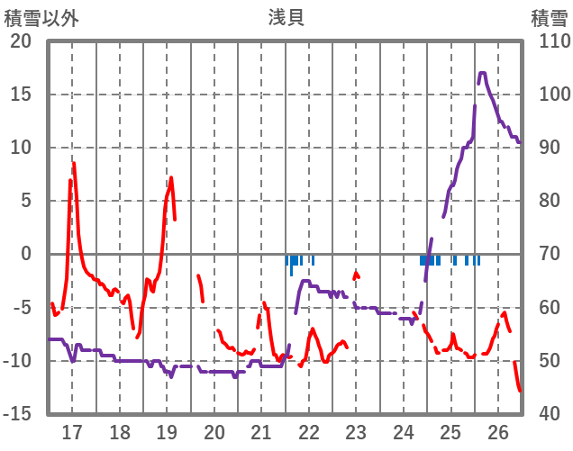 | 日 | 時 | 気温 | 降水 | 風向/風速 | 日照 | 積雪 | 降雪 |