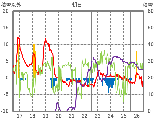 | 日 | 時 | 気温 | 降水 | 風向/風速 | 日照 | 積雪 | 降雪 |