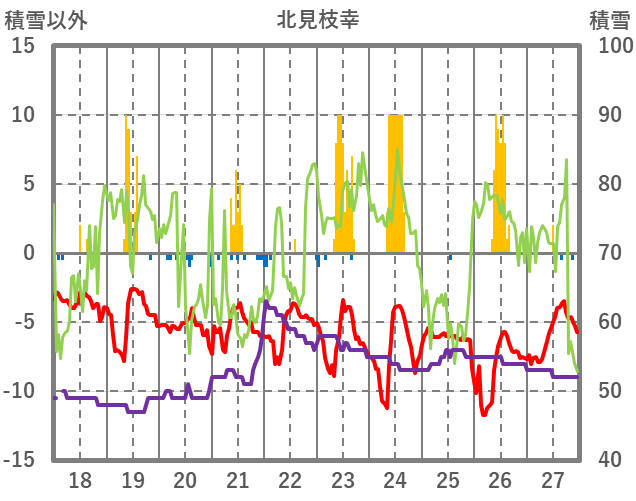 | 日 | 時 | 気温 | 降水 | 風向/風速 | 日照 | 積雪 | 降雪 |