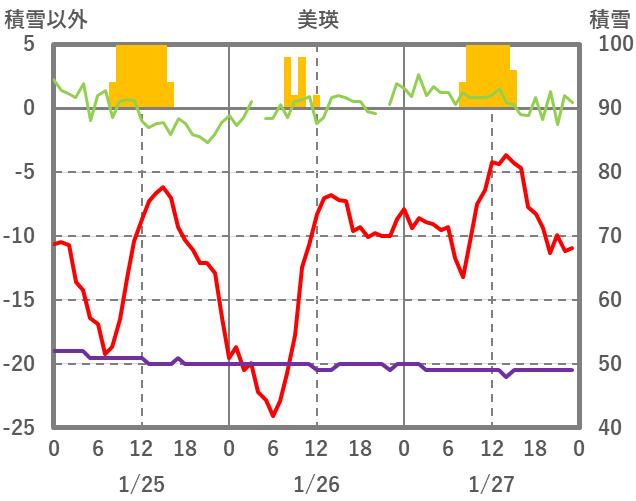 | 日 | 時 | 気温 | 降水 | 風向/風速 | 日照 | 積雪 | 降雪 |