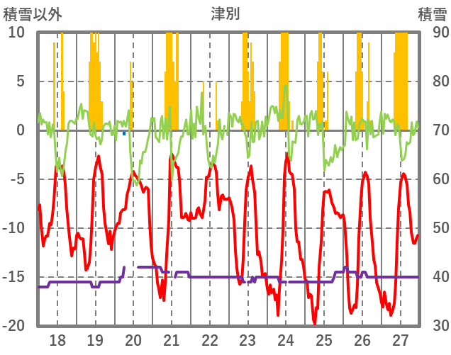 | 日 | 時 | 気温 | 降水 | 風向/風速 | 日照 | 積雪 | 降雪 |