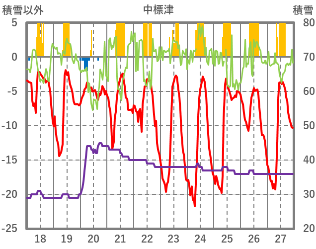 | 日 | 時 | 気温 | 降水 | 風向/風速 | 日照 | 積雪 | 降雪 |