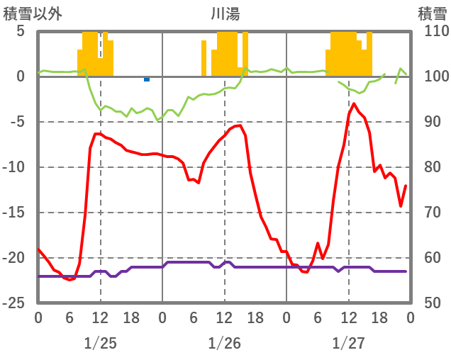 | 日 | 時 | 気温 | 降水 | 風向/風速 | 日照 | 積雪 | 降雪 |