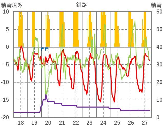 | 日 | 時 | 気温 | 降水 | 風向/風速 | 日照 | 積雪 | 降雪 |