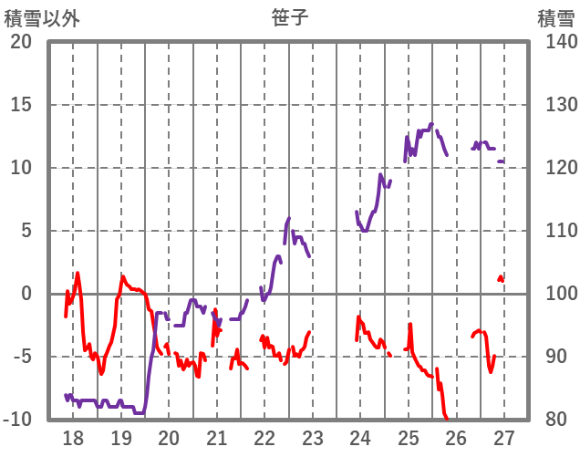 | 日 | 時 | 気温 | 降水 | 風向/風速 | 日照 | 積雪 | 降雪 |