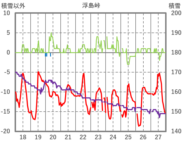 | 日 | 時 | 気温 | 降水 | 風向/風速 | 日照 | 積雪 | 降雪 |