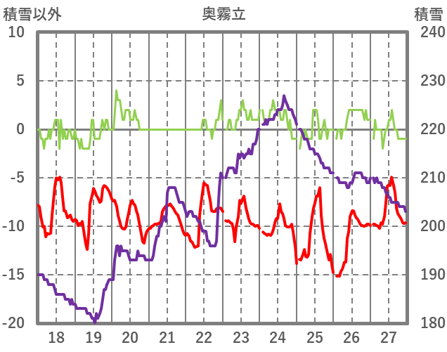 | 日 | 時 | 気温 | 降水 | 風向/風速 | 日照 | 積雪 | 降雪 |