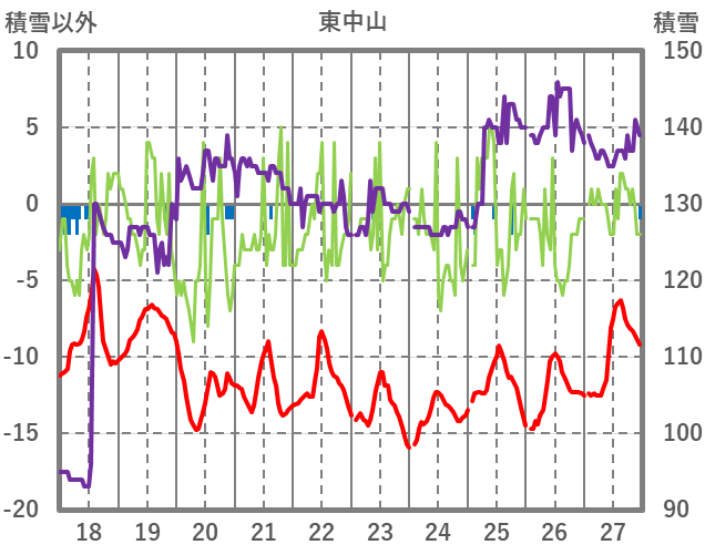 | 日 | 時 | 気温 | 降水 | 風向/風速 | 日照 | 積雪 | 降雪 |