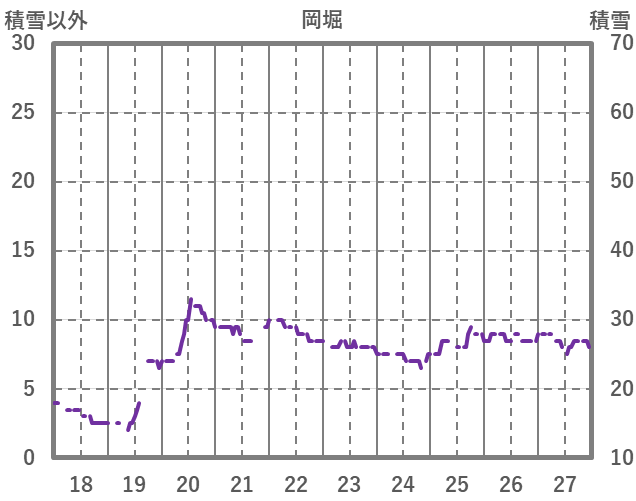 | 日 | 時 | 気温 | 降水 | 風向/風速 | 日照 | 積雪 | 降雪 |