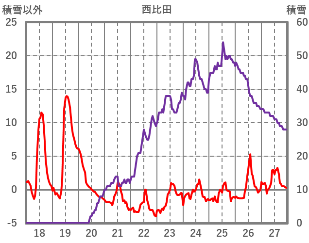 | 日 | 時 | 気温 | 降水 | 風向/風速 | 日照 | 積雪 | 降雪 |
