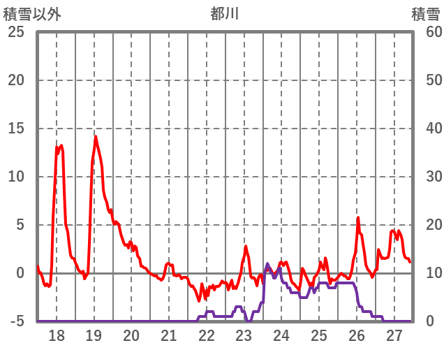| 日 | 時 | 気温 | 降水 | 風向/風速 | 日照 | 積雪 | 降雪 |