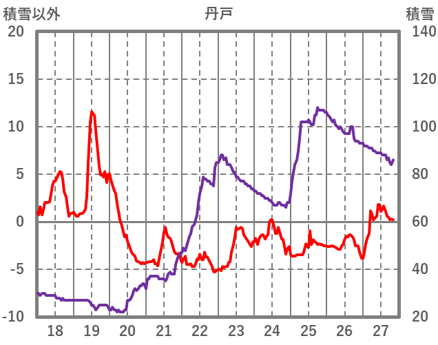 | 日 | 時 | 気温 | 降水 | 風向/風速 | 日照 | 積雪 | 降雪 |
