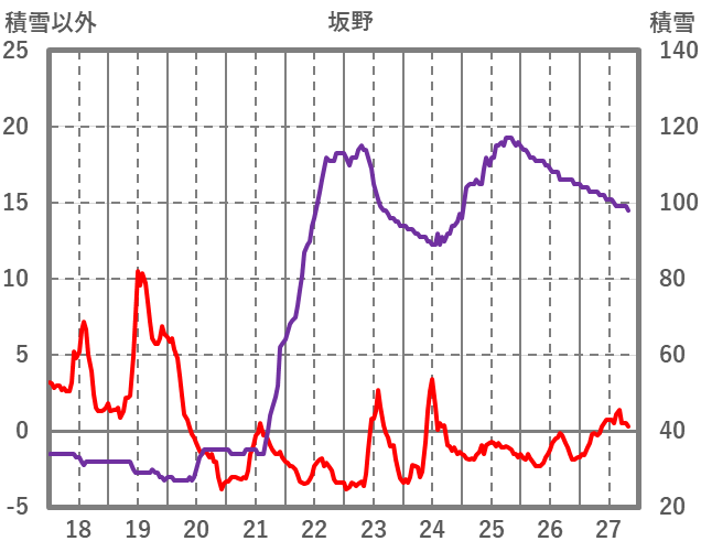 | 日 | 時 | 気温 | 降水 | 風向/風速 | 日照 | 積雪 | 降雪 |