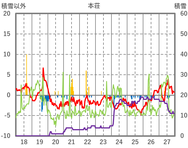 | 日 | 時 | 気温 | 降水 | 風向/風速 | 日照 | 積雪 | 降雪 |