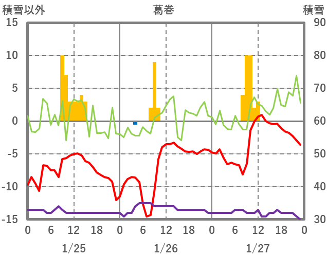 | 日 | 時 | 気温 | 降水 | 風向/風速 | 日照 | 積雪 | 降雪 |