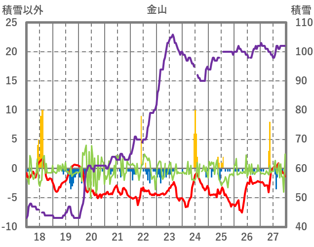 | 日 | 時 | 気温 | 降水 | 風向/風速 | 日照 | 積雪 | 降雪 |