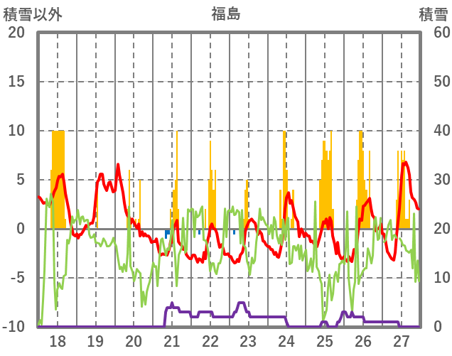 | 日 | 時 | 気温 | 降水 | 風向/風速 | 日照 | 積雪 | 降雪 |
