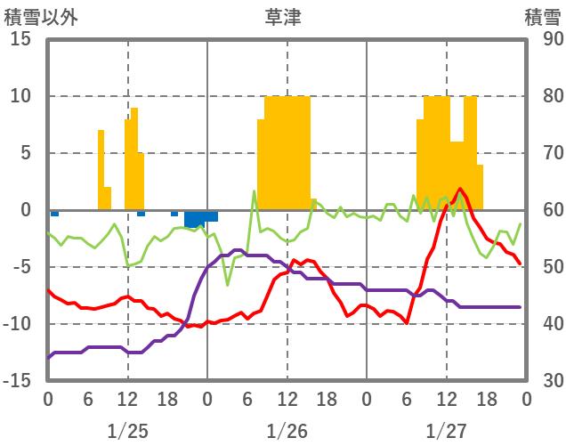 | 日 | 時 | 気温 | 降水 | 風向/風速 | 日照 | 積雪 | 降雪 |