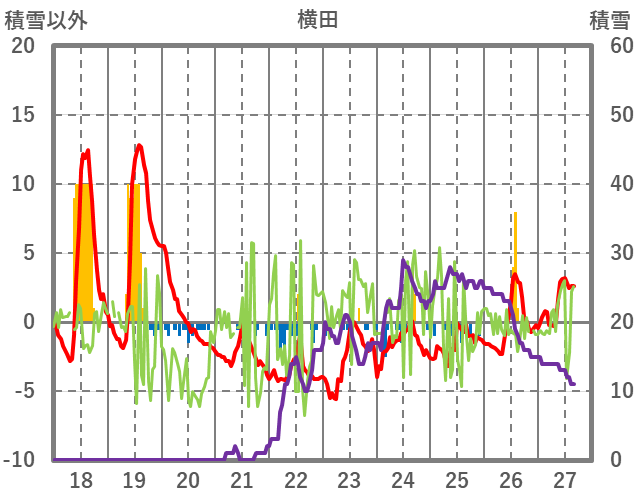 | 日 | 時 | 気温 | 降水 | 風向/風速 | 日照 | 積雪 | 降雪 |