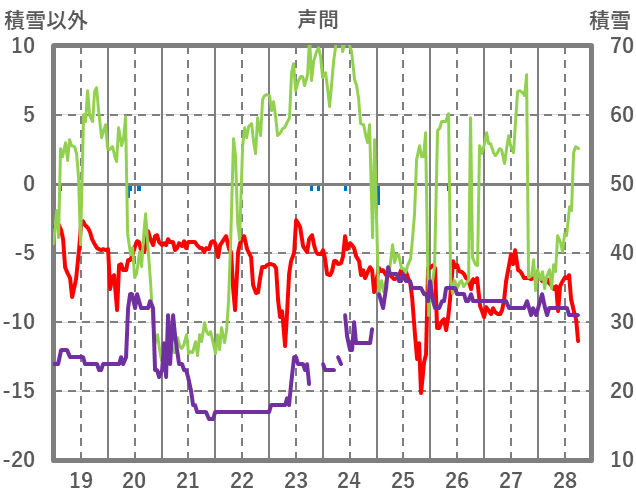 | 日 | 時 | 気温 | 降水 | 風向/風速 | 日照 | 積雪 | 降雪 |