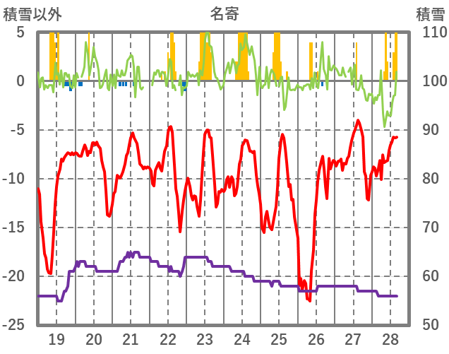 | 日 | 時 | 気温 | 降水 | 風向/風速 | 日照 | 積雪 | 降雪 |