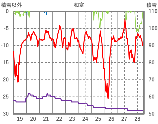 | 日 | 時 | 気温 | 降水 | 風向/風速 | 日照 | 積雪 | 降雪 |