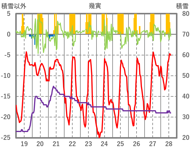| 日 | 時 | 気温 | 降水 | 風向/風速 | 日照 | 積雪 | 降雪 |