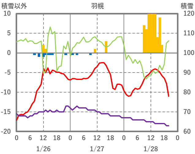 | 日 | 時 | 気温 | 降水 | 風向/風速 | 日照 | 積雪 | 降雪 |