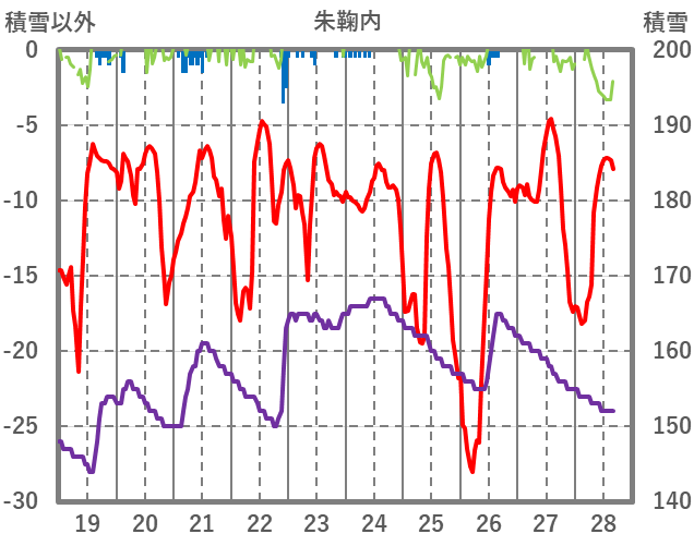 | 日 | 時 | 気温 | 降水 | 風向/風速 | 日照 | 積雪 | 降雪 |
