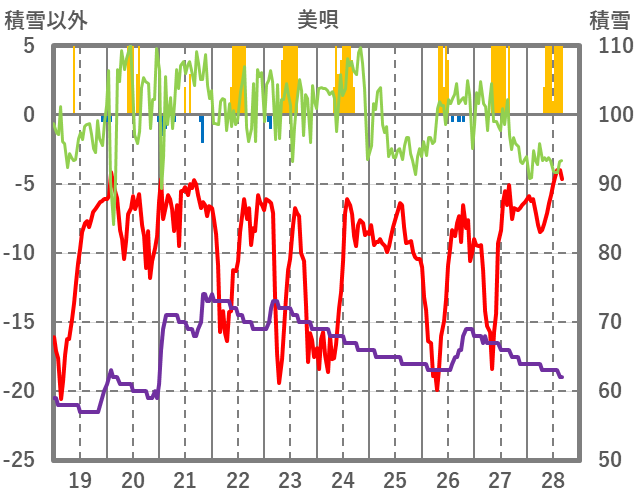| 日 | 時 | 気温 | 降水 | 風向/風速 | 日照 | 積雪 | 降雪 |