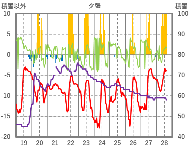 | 日 | 時 | 気温 | 降水 | 風向/風速 | 日照 | 積雪 | 降雪 |