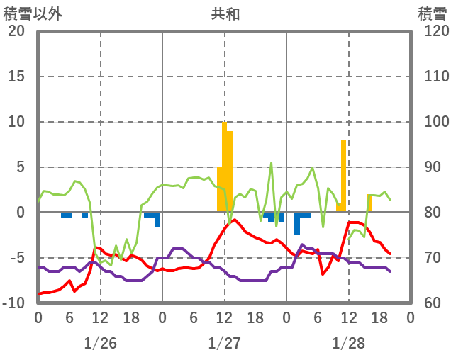 | 日 | 時 | 気温 | 降水 | 風向/風速 | 日照 | 積雪 | 降雪 |