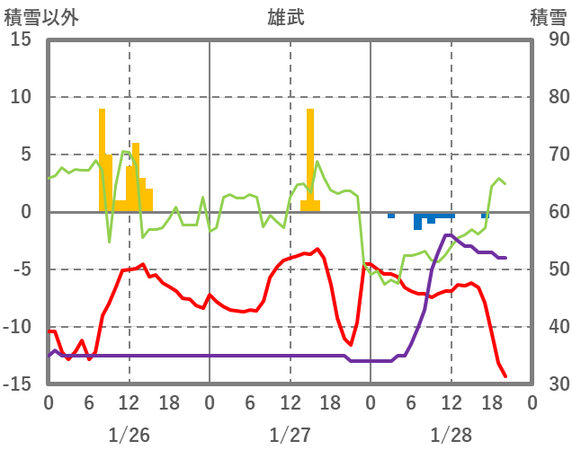 | 日 | 時 | 気温 | 降水 | 風向/風速 | 日照 | 積雪 | 降雪 |