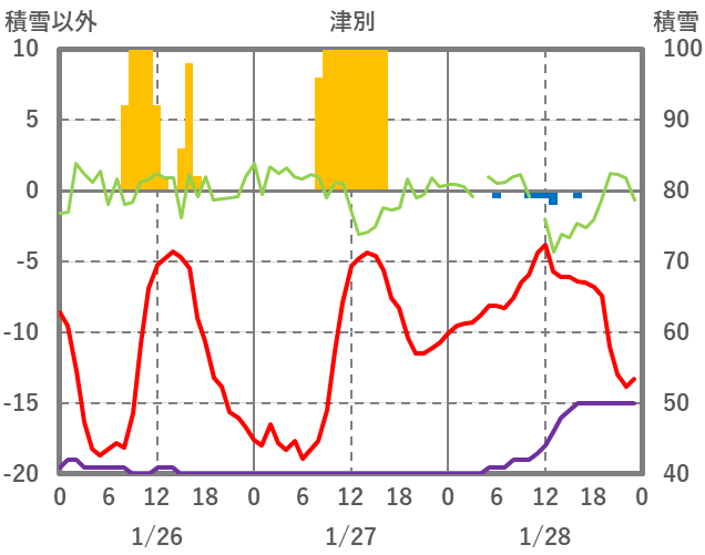 | 日 | 時 | 気温 | 降水 | 風向/風速 | 日照 | 積雪 | 降雪 |