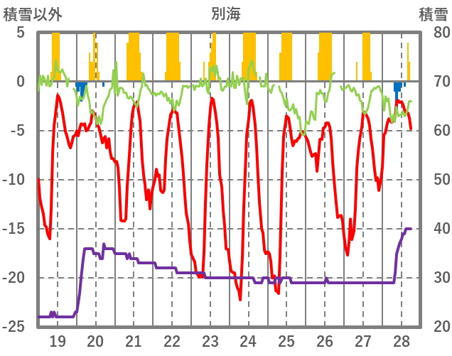 | 日 | 時 | 気温 | 降水 | 風向/風速 | 日照 | 積雪 | 降雪 |