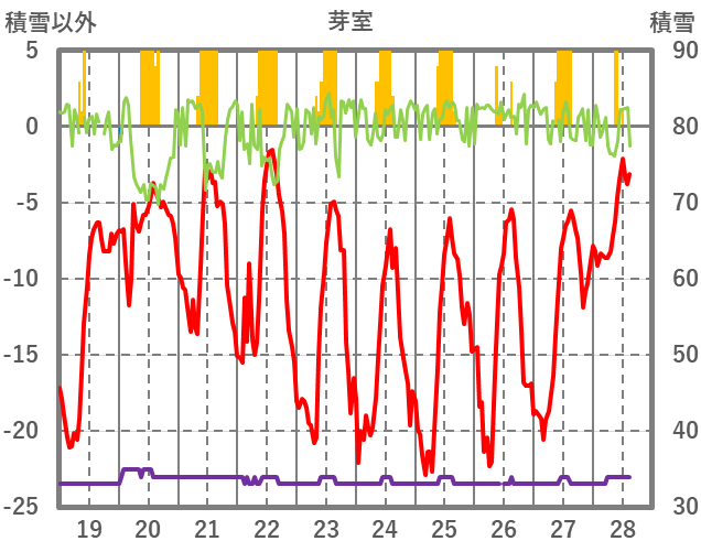 | 日 | 時 | 気温 | 降水 | 風向/風速 | 日照 | 積雪 | 降雪 |