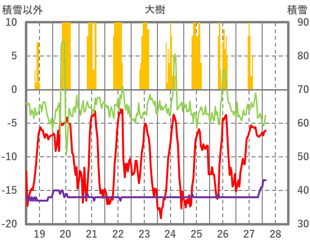 | 日 | 時 | 気温 | 降水 | 風向/風速 | 日照 | 積雪 | 降雪 |