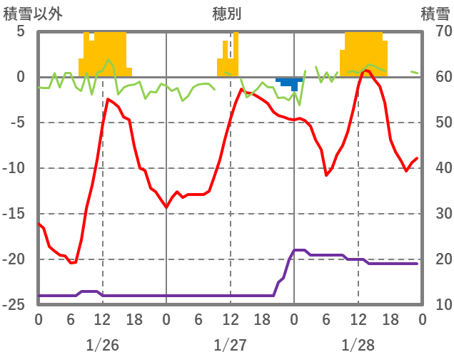 | 日 | 時 | 気温 | 降水 | 風向/風速 | 日照 | 積雪 | 降雪 |