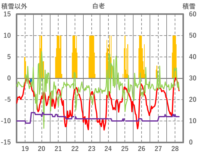 | 日 | 時 | 気温 | 降水 | 風向/風速 | 日照 | 積雪 | 降雪 |