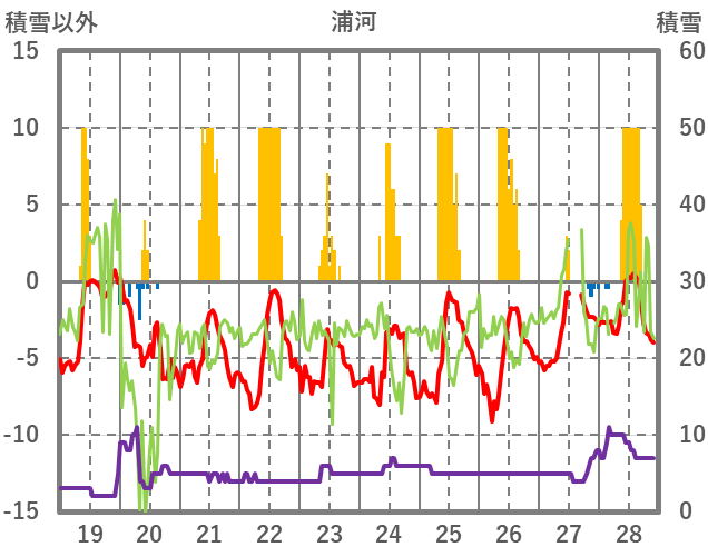| 日 | 時 | 気温 | 降水 | 風向/風速 | 日照 | 積雪 | 降雪 |