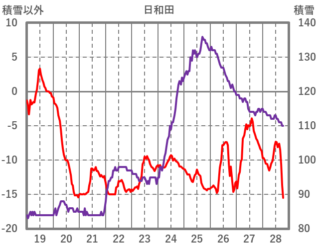 | 日 | 時 | 気温 | 降水 | 風向/風速 | 日照 | 積雪 | 降雪 |