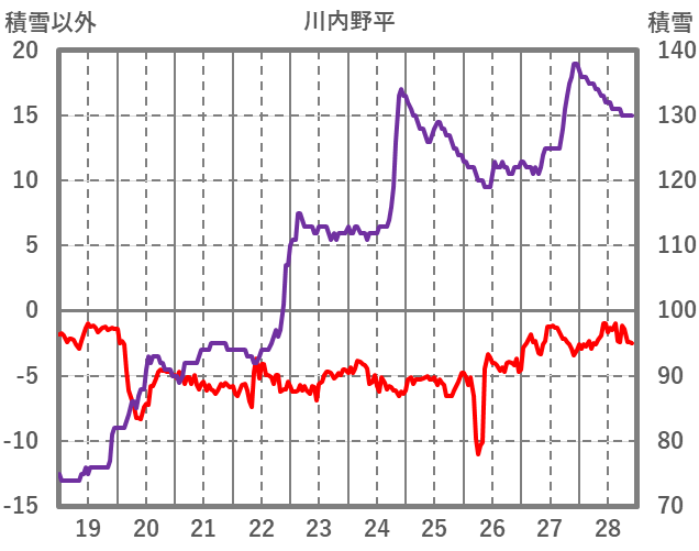 | 日 | 時 | 気温 | 降水 | 風向/風速 | 日照 | 積雪 | 降雪 |